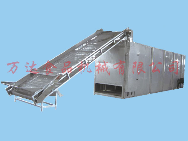 本機由電加熱裝置、提升、輸送裝置、烘箱、傳送變速裝置、送風裝置等組成。離心風機將經電加熱器加熱的空氣送入烘箱底部,經分層進風裝置將熱空氣分配給各層傳送網帶,蒜片由提升機,經振動篩均勻攤平在循環運轉的烘干網帶上,徐徐送入烘箱,蒜片一上傳送網帶就開始加熱升溫,再經五層傳送網帶自上至下倒翻逐漸失水烘干,最后經出料口送出。烘箱由五層不銹鋼網帶接于拽引鏈上,形成五組閉式循環,各層間均采用同規格的大滾珠鏈條傳動,各層傳送網帶運行速度可根據實際需要調節,以符合蒜片失水及干燥的規律。此外烘箱內尚有分層進風機構,使層間適量補充干燥熱風,提高層間熱風溫度,降低層間濕含量,提高失水能力。